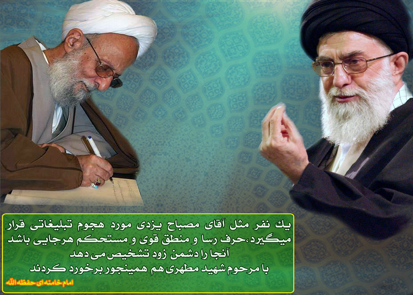 و در آخر جمله ای از امام خامنه ای پس از موج اهانت ها علیه آیت الله مصباح : «یک نفر مثل آقای مصباح یزدی مورد هجوم تبلیغاتی قرار می گیرد.حرف رسا و منطق قوی و مستحکم هرجایی باشد آنجا را دشمن زود تشخیص می دهد.با مرحوم شهید مطهری هم همین جور برخورد کردند.